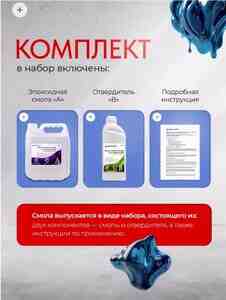 Комплектация - эпоксидная смола 2 кг; отвердитель 1 кг; инструкия