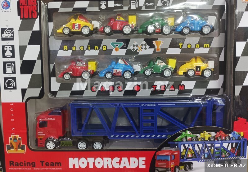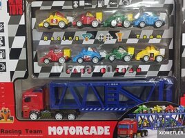 В набор входят машинки с инерционным механизмом движения и автовоз. Высота маленьких машинок 3 см, высота автовоза 7 см.
