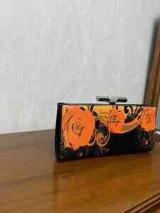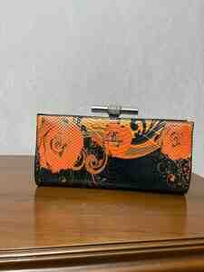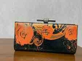 - Rəng və naxış: Qara fon üzərində narıncı güllü və abstrakt naxışlar; ilan dərisi effektli tekstura.