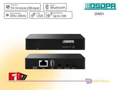DSPPA DW01 - Wi-Fi və Bluetooth üzərindən musiqi ötürülməsini təmin edən ağıllı audio streminq ön gücləndiricisidir. Qurğu fon musiqisi və multi-room audio sistemləri üçün nəzərdə tutulmuşdur və mövcud səs sistemlərinin imkanlarını genişləndirir.