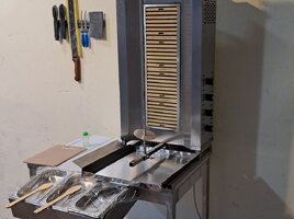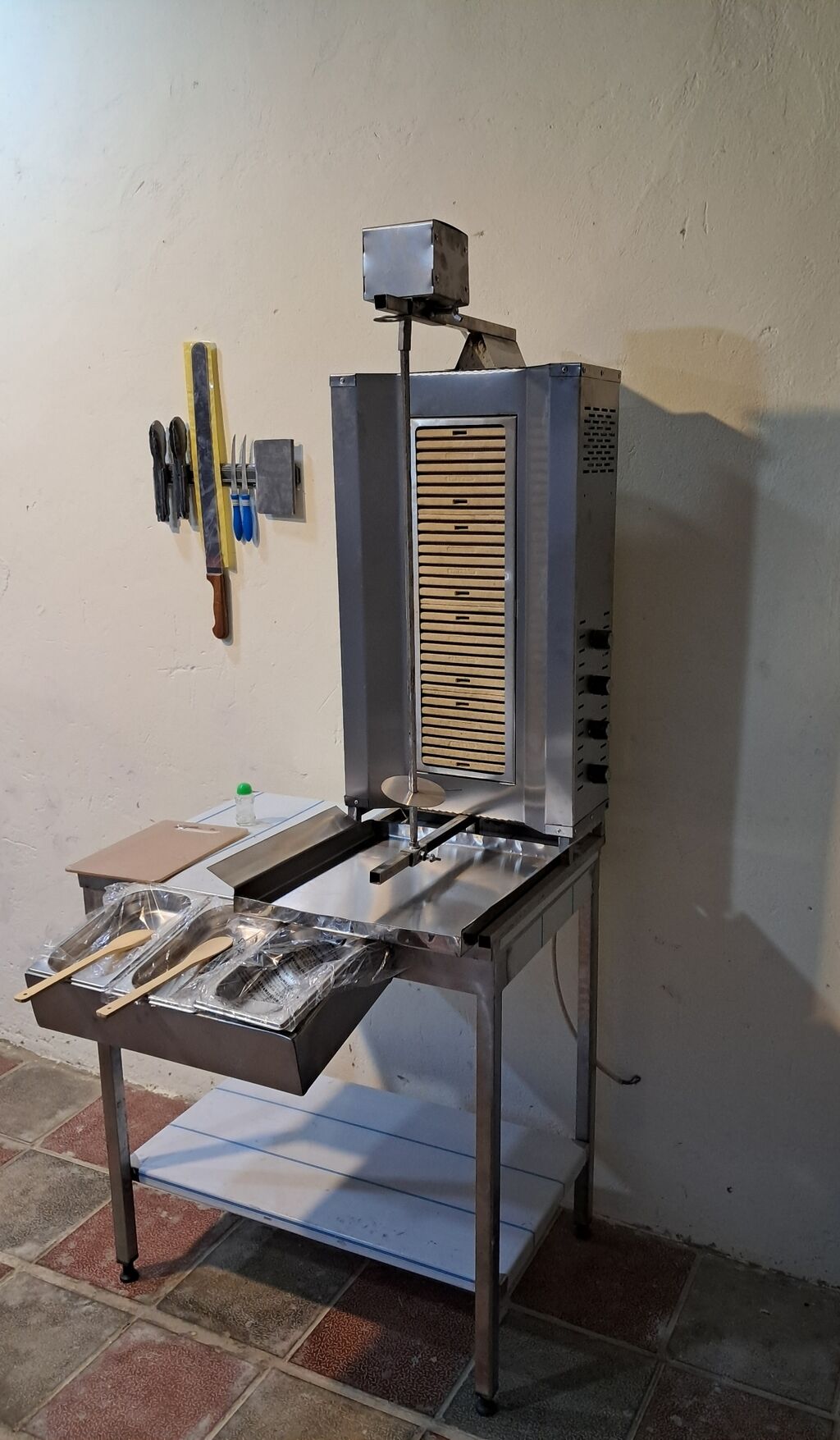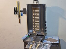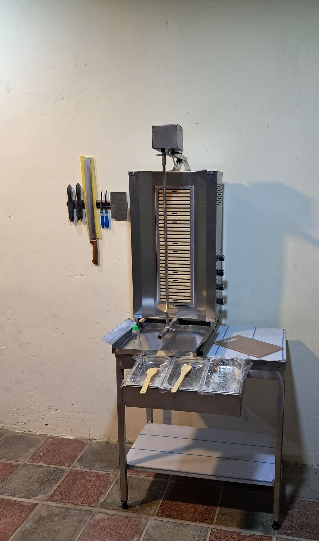 Şirkət100 Azn Donerxana avadanlığı Döner aparatı 4 gözlu 220w nol faza 2 xodlu üsten matorlu Dönər bıçağı təzə Asılqan maqnit Konteyner salat qablari nerj + salat qabi tezgahı nerj Göyərti daskasi Əlavə bıçağlar Naqqaslar Mayonez