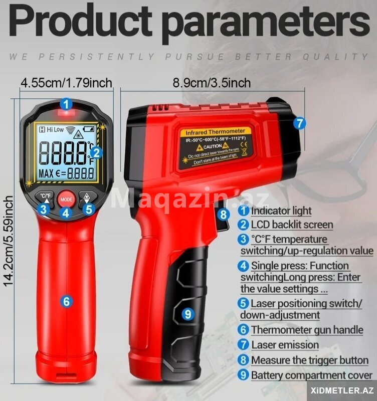- Bu infraqırmızı termometr qeyri-şəffaf obyektlərin səthinin temperaturunu ölçə bilər. Ölçmə alətinin optik komponentləri cisimlər tərəfindən yayılan əks olunan və ötürülən enerjini aşkar edə və enerjini detektorda toplaya bilər, bu da onu müxtəlif yüksək temperaturlu, zəhərli və ya çətin əldə edilən obyektlərin səthinin temperaturunu tez ölçmək üçün əlverişli edir.