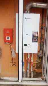 - Kombi: Modena markası, divara quraşdırılan, baca çıxışı ilə. Cihaz üzərində rəqəmsal ekranlı idarə paneli və mexaniki temperatur tənzimləmə düyməsi mövcuddur. Qaz xəttinə və su dövriyyəsinə qoşulu, paslanmayan polad baca borusu ilə.