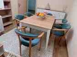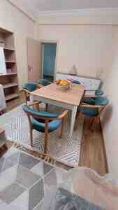 Uyğun interyer: Müasir, skandinaviya və minimal üslublar. Otaqlarda səliqəli görünüş yaradır. Rəng palitrası neytral tonlarla (ağ, bej, ağac fakturası) harmoniyadadır; mavi stullar məkanın vurğusudur. Qonaq və yemək zonası üçün praktik və estetik həll.