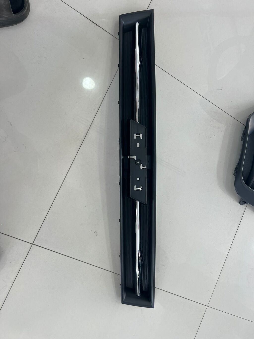 - Ön bamper üçün uzun, dar dekorativ barmaq-bəzək paneli (qara korpus, ortada xrom zolaq). Panel üzərində nömrə/aksesuar bərkidilməsi üçün mötərizə yerləri mövcuddur.