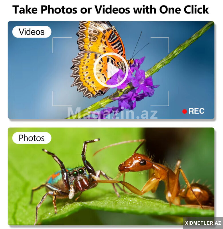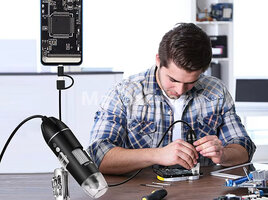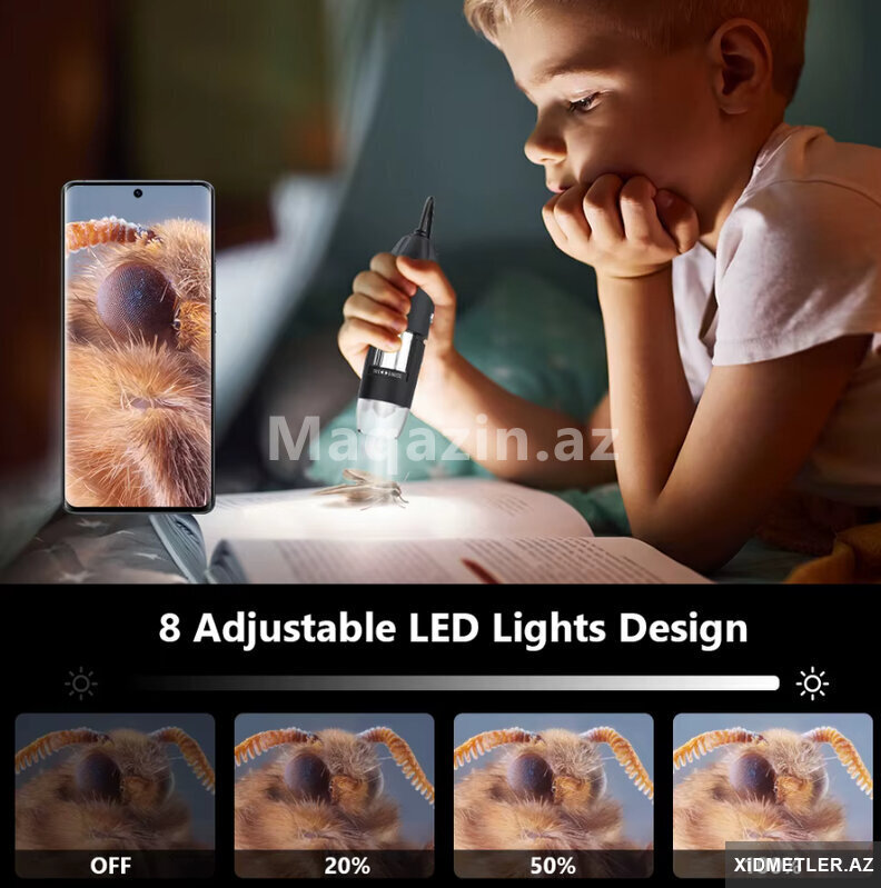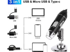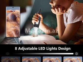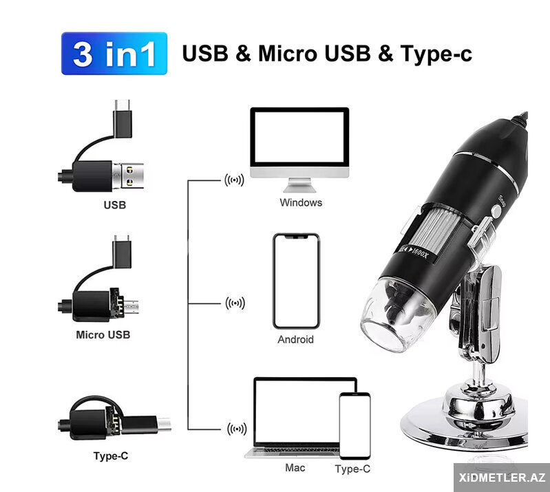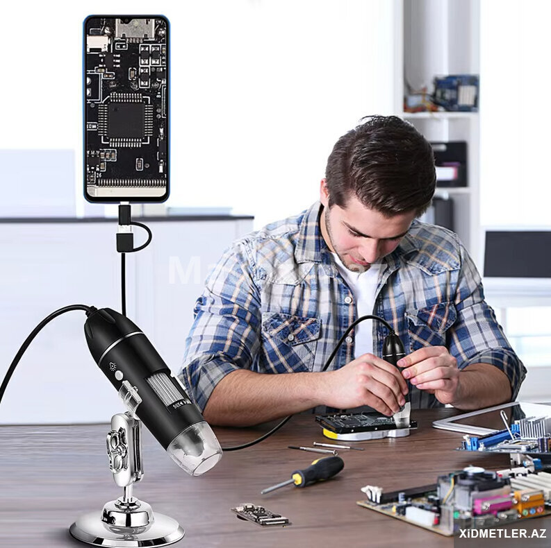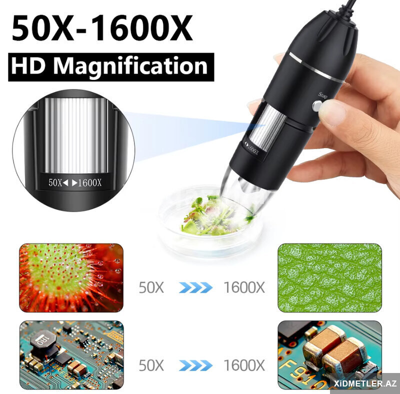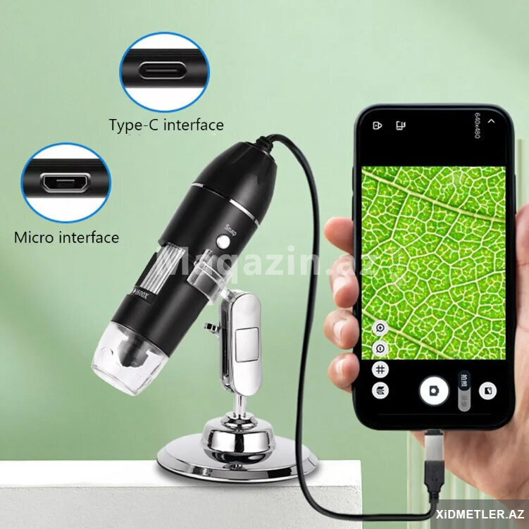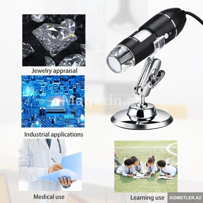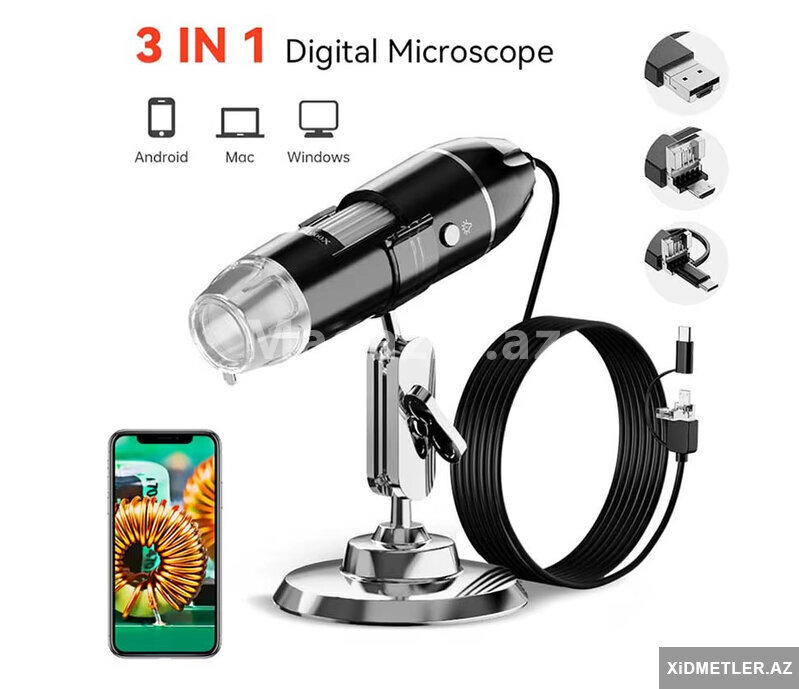 Mikraskop 1600 dəfə böyüdür.Usb ilə kompyuterə və telefona qoşlur.Typec , micro usb və usb ilə qoşulur.Saçın dibinə, dəriyə, elektornik plataya , saat təmiri , uşaqların ətrafı heyvanların kəşfi və s yerlərdə istifadə edə bilərsiz.