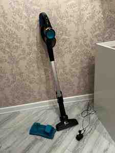 • Vakuum və Nəm Təmizləmə (Aqua Sistemi): Cihazın ən böyük özəlliyi eyni anda həm tozu çəkməsi, həm də döşəməni silməsidir. Şəkildə yerdə görünən göy rəngli su çəni və mikrofiber parça bu iş üçün nəzərdə tutulub.