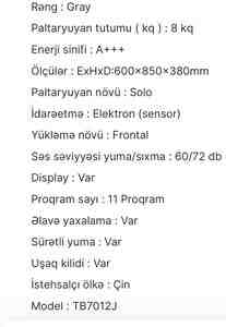 1169 Azn Cəmi 1 dəfə işlənib. Almanya. 7.5 kg həcmi. Malın növü: Paltaryuyanlar Yeni: Bəli