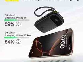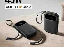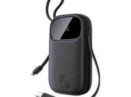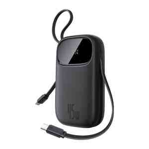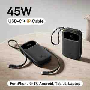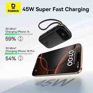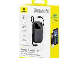 Baseus firmasından 2 portlu, üzərində USB-C və Lightning kabeli olan 45W sürətli çıxışa malik power bank