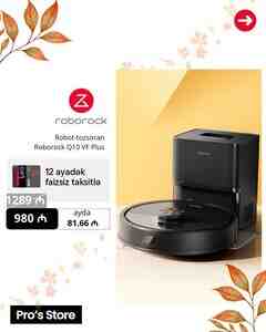 2999 Azn Brend: Roborock Model: S9 MaxV Ultra Sorma gücü: 22000 Pa Akkumulyatorun həcmi: 6400 mAh Şarj müddəti: 150 dəqiqə Təmizlik sahəsi: 240 m² İşləmə müddəti: 180 dəqiqə Təmizləmə növü: Nəm, Quru Baza çirkli su qabı: 3,5