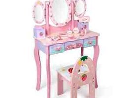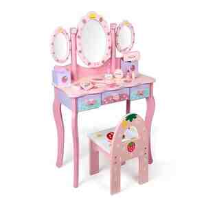 Bəzənmə masası və stul 0019d. Uşaq üçün tematik bəzənmə masası və stul dəsti. - Şirin çiyələk və taç motivli dizayn, pastel çəhrayı-bənövşəyi rəng palitrası. - Üç güzgülü konstruksiya: iri oval mərkəz [читат далше]