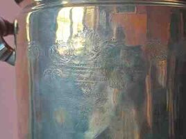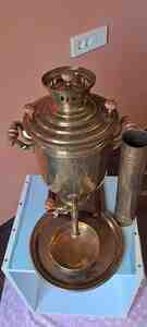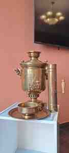Bataşev Fabrikinin 1888-ci il istehsalı qədim samovarı. Həm gövdəsində, həm qapağında, həm də ayaq hissəsində medalları var. Podnosu, stəkan yumaq üçün qabı, bacası və bacanın qapağı da var.
