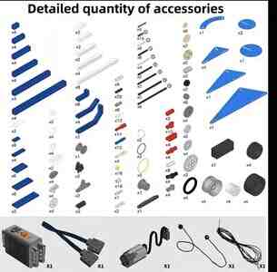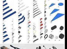 - 396 ədəd müxtəlif detallar: mavi-ağ konstruksiya elementləri, oxlar və pinlər, dişlilər, kasnaklar, kəmərlər, kabellər, təkərlər və disklər.