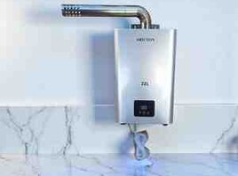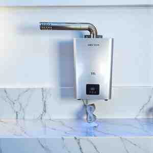 Qazla işləyən divar tipli su qızdırıcıları (geyzer) – paslanmayan polad gövdə və elektron idarəetmə paneli ilə.