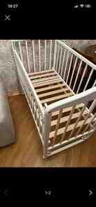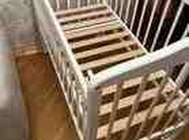 250 Azn Uşaq otağı üçün dəst: beşik və komod - Beşik: ağ və açıq ağac tonlarında, yanları barmaqlı, ulduz dekorlu. Ön barmaqlıq sürüşmə mexanizmi ilə aşağı-yuxarı hərəkət edir. Alt hissədə iki geniş çekmece var – paltar, bez və