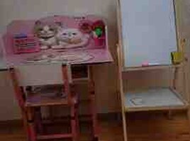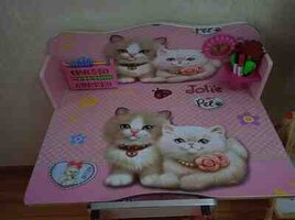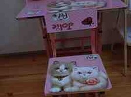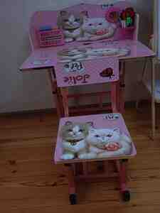 - Masa-stul: Rozı rəngli, pişikli dizayn. Masanın üst hissəsində kiçik rəf, marker/qələm tutacağı və sayma üçün abakus mövcuddur. Oturacaq və arxa hissə eyni dizaynda. Çərçivə metal konstruksiyalıdır. Masanın altında kiçik bölmə var.