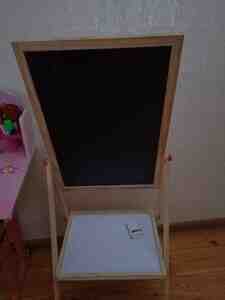 - Lövhə: Taxta karkaslı, ikiüzlü — bir tərəfi ağ marker lövhəsi, digər tərəfi təbaşir üçün qara lövhə. Aşağıda əlavə rəf yerləşir. Marker və silgi üçün yer uyğundur.