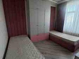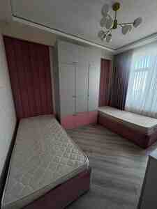50 Azn - İki ədəd tək çarpayı: hər iki tərəfdə yumşaq başlıq - Ortada yazı masası: geniş iş səthi, bir qapılı dolab və çekmece, ayaqaltı üçün boş zona. - Üst modul: açıq rəflər və qapalı şkaflar kombinasiyası, kitab, dekor və