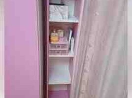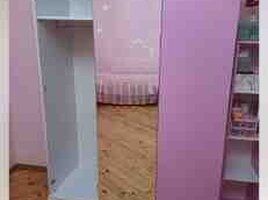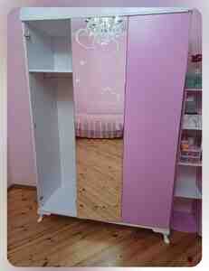 700 AznUşaq otağı üçün mebel dəsti - Rəng: açıq bənövşəyi/lilac, krem detallar ilə - Üslub: klassik dekorativ frezlər və çiçək formalı tutacaqlar Dəst tərkibi: 1) Üç qapılı şkaf - Orta hissədə asılqan bölməsi - Kənar qapılar