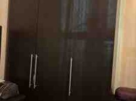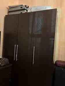 - 3 qapılı paltar şkafı (tünd qəhvəyi, uzun metal tutacaqlar)