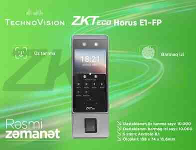 Şirkət1850 Azn ZKTeco Horus E2-FP Face Recognition Terminal (Android) ZKTeco Horus E2-FP ZKTeco Horus E2-FP, üz tanıma, barmaq izi, kart və şifrə ilə identifikasiya imkanları təqdim edən professional giriş və vaxt–davamiyyət nəzarət